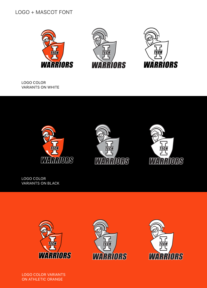 When using the Indiana Tech logo to accompany an athletic logo, the orange must be PMS 17C or the web color #FA4616 to match the offical athletic orange color of Indiana Tech.